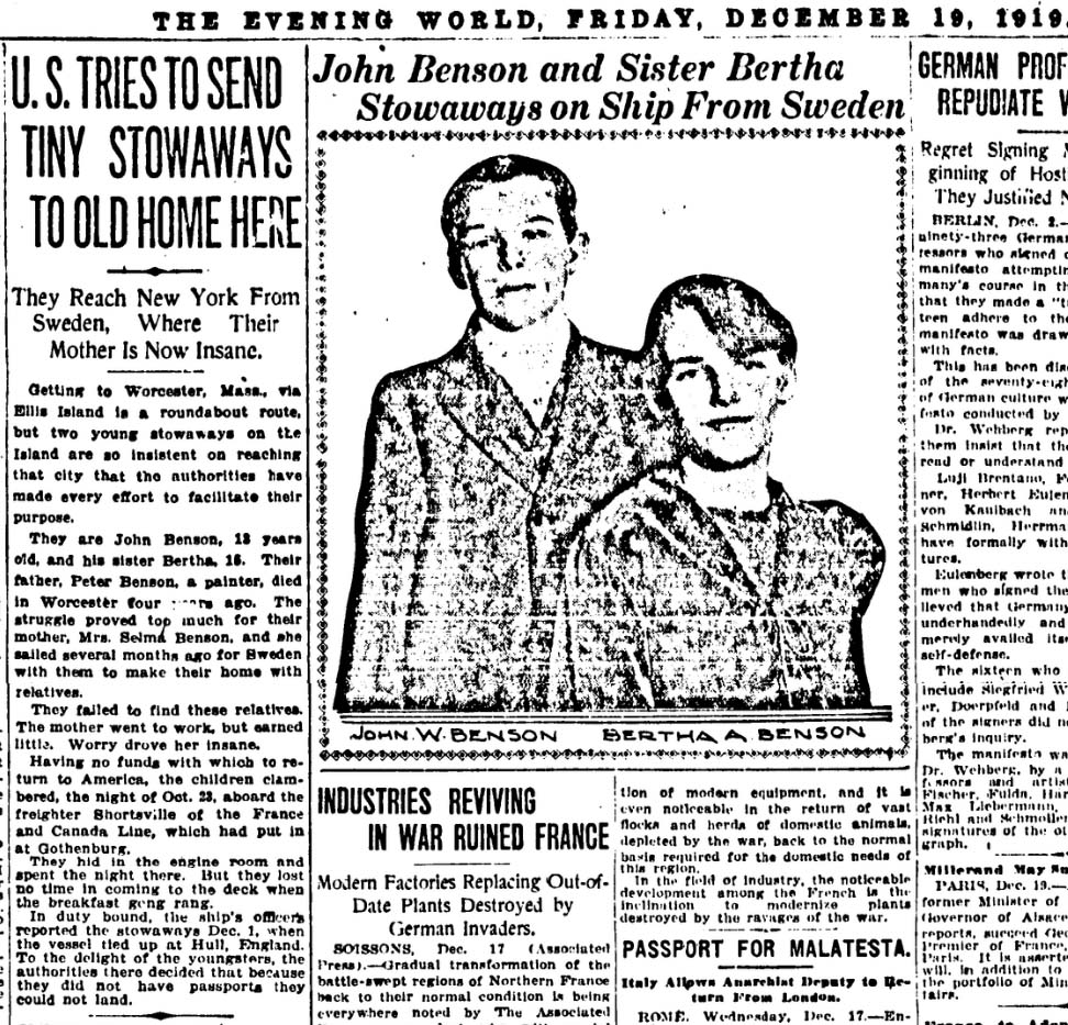 They are John Benson, 13 years old, and his sister Bertha, 11. Their father, Peter Benson, a painter, died in Worcester four years ago. The struggle proved too much for their mother, Mrs. Selma Benson, and she sailed several months ago for Sweden with them to make their home with relatives.