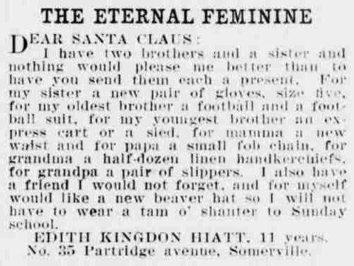 Edith wrote a letter to Santa in December, 1906, when she was 11 years old. She did this to enter a contest. The Boston American newspaper gave away $2 each day to the child who wrote the best letter. Today $2 is about $50.