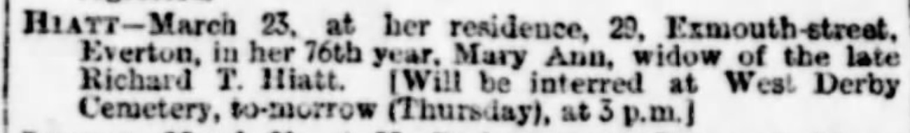 The Liverpool Weekly Mercury Liverpool, Merseyside, England, Saturday, October 06, 1877 page 5, death of Henry J Hiatt, chronometer maker