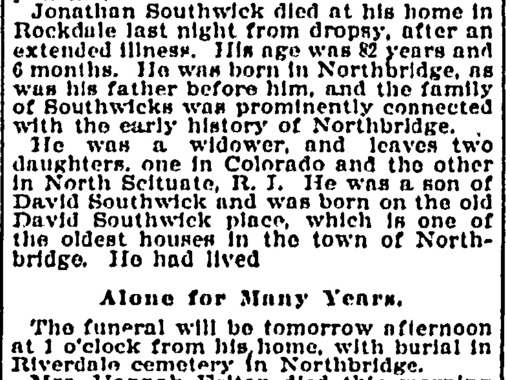Ancestry.com. Massachusetts, U.S., Death Records, 1841-1915, _Pre 1903, 1902, line 3, Jonathan Southwick death.