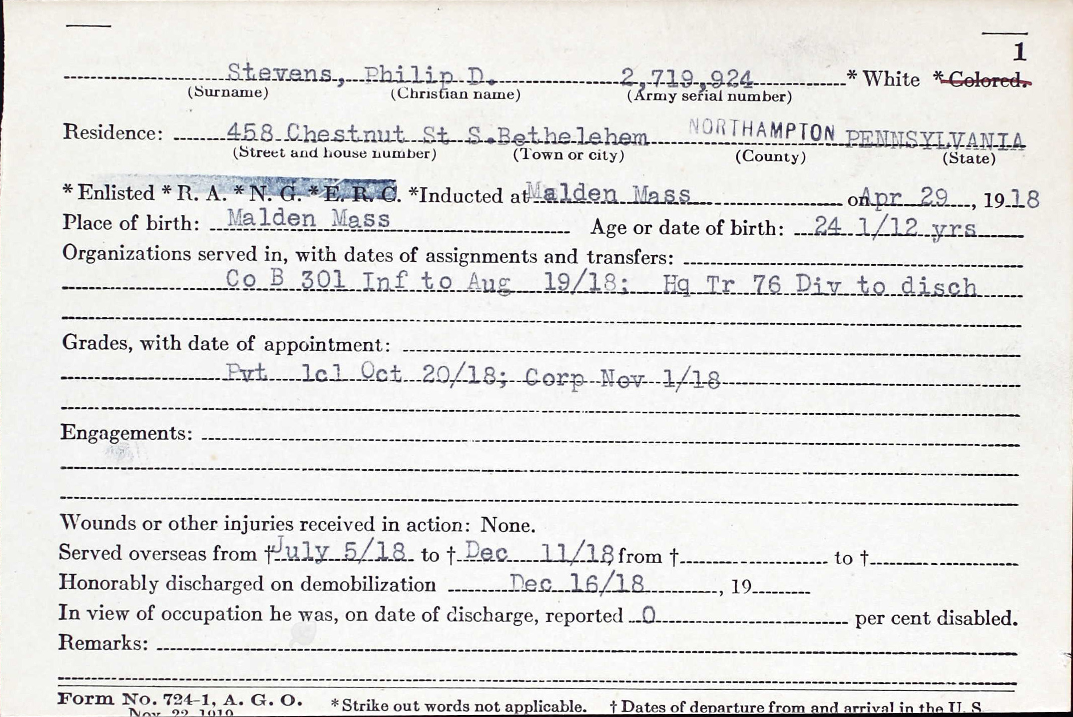 Ancestry.com. Pennsylvania, World War I Veterans Service and Compensation Files, 1917-1919, 1934-1948 for Phillip D Stevens